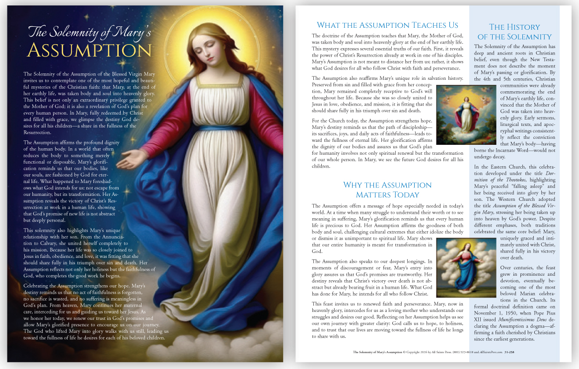 Celebrate the Solemnity of the Assumption with this inspiring bulletin insert. Explore the meaning of Mary’s being taken body and soul into heaven, learn the ancient history of the feast, and discover why her destiny strengthens our own hope in Christ. A beautiful, uplifting resource for deepening parish devotion.
