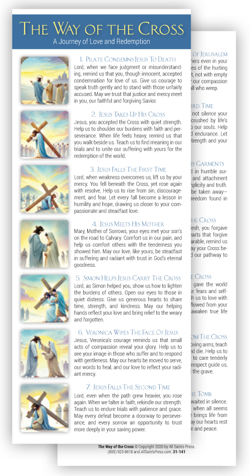 The Stations of the Cross is a revered traditional devotion for the Lenten season. This conveniently formated handout card is designed to facilitate reflection on the paschal mystery and also contain a prayerful reflection for each of the stations. Also available in English. Order Code 31-141